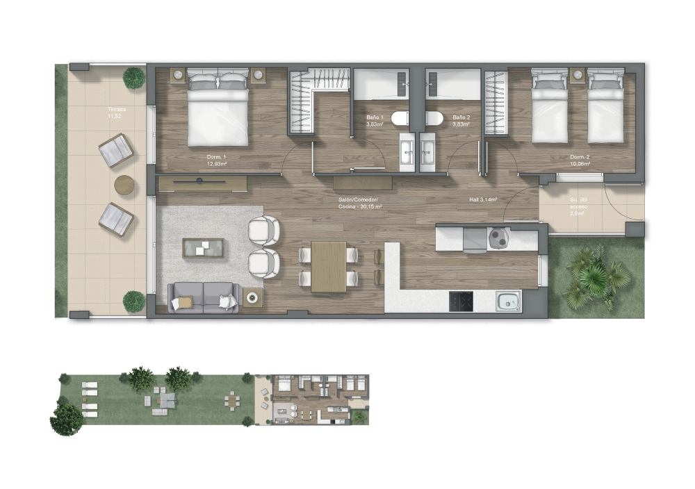 Two-bedroom homes with garden, ground floor and penthouses with solarium, which one is yours?
